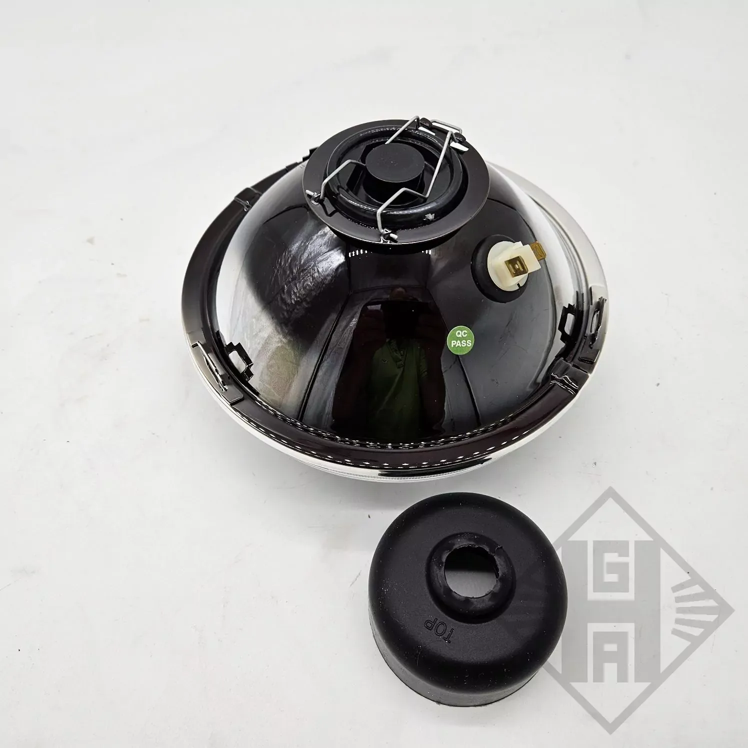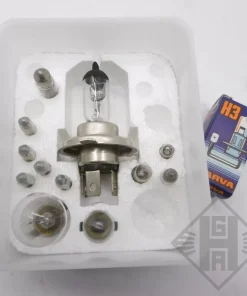 Der Scheinwerfer hat eine Aufnahme für eine Bilux Glühlampe als Hauptlichtlampe und seitlich im Gehäuse die Fassung für die Standlichtlampe.